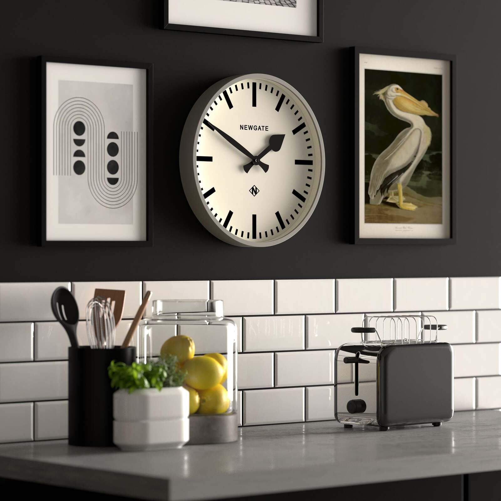 Newgate Railway Clock Grey A neutral grey station wall clock with a bold marker dial, black spade and batton hands and a minimalist straight-cut case.