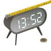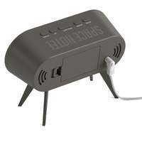 The unusual alarm clock design incorporates a 12 or 24-hour time display, a digital beep alarm, a snooze function, night mode and brightness adjustment, and an optional temperature display.