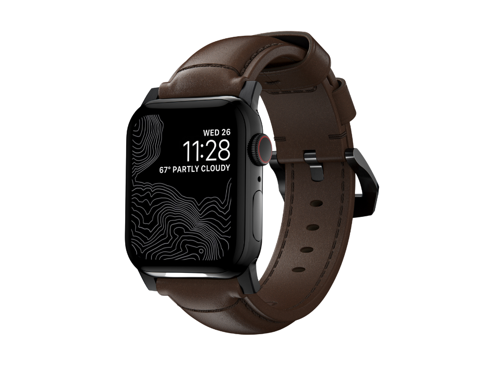 DESCRIPTION:Designed to give your Apple Watch a classic yet bold new look. Made from minimally treated vegetable tanned leather from one of America's oldest tanneries. The leather is designed to beautifully patina with time creating a handsome rich leather band with a look that is uniquely yours.|FEATURES:- Brown Horween leather from the USA - Develops a rugged patina - Custom stainless steel lugs and buckle - Designed for Apple Watch Series 8 7 6 SE and all previous versions of Apple Watch|