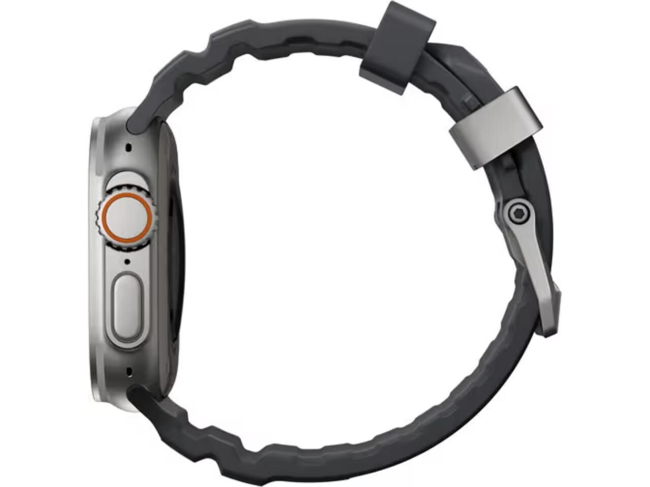 Overview:Introducing the Nomad Rocky Point Watch Band the perfect companion for your Apple Watch. Engineered for rugged activities—cycling gym workouts or daily challenges—this band is crafted from ultra-durable FKM fluoroelastomer rubber and lightweight titanium combining toughness with sleek design. Unmatched Durability Made from compression-moulded FKM rubber the Rocky Point band is 100% waterproof and built for demanding environments. Ventilation grooves ensure all-day comfort during intense activities. Precision Engineering With grade 2 titanium hardware the band is built to last while remaining lightweight. Titanium components secure any excess band providing a snug fit that stays in place allowing you to focus on your performance. Perfect Fit for Apple Watch Ultra Designed for the Apple Watch Ultra and Ultra 2 this band integrates seamlessly with your device enhancing functionality and style. Its one-size-fits-most design ensures adaptability for any adventure.|Features:Take on your next challenge with a band designed to handle every adventure Ultimate comfort with ventilation grooves that keep your wrist cool Experience seamless integration with your Apple Watch Ultra for a sleek modern look Lightweight titanium hardware protects your band & shields against wear and tear Dive into any activity - rain or shine - with a 100% waterproof band that’s ready for anything Enjoy all-day comfort Rocky Point adapts & moulds perfectlyto your wrist|