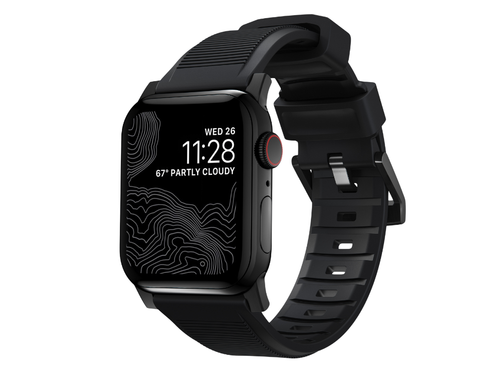 DESCRIPTION:Designed to give your Apple Watch a modern rugged look for daily wear or on your next adventure. Rugged Band is constructed from FKM a soft yet strong fluoroelastomer that combines all-day comfort with lasting durability. Custom-designed injection-molded stainless steel hardware provides a secure fit and unique style.|FEATURES:- FKM fluoroelastomer rubber - Breathable ribbed design - Fully waterproof - Custom stainless-steel lugs and buckle - Designed for Apple Watch Series 8 7 6 SE and all previous versions of Apple Watch|