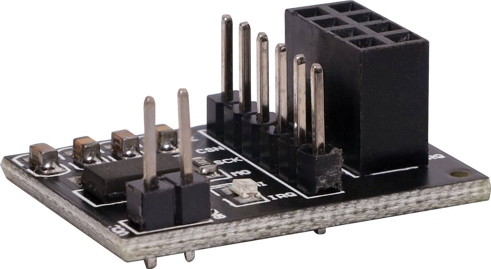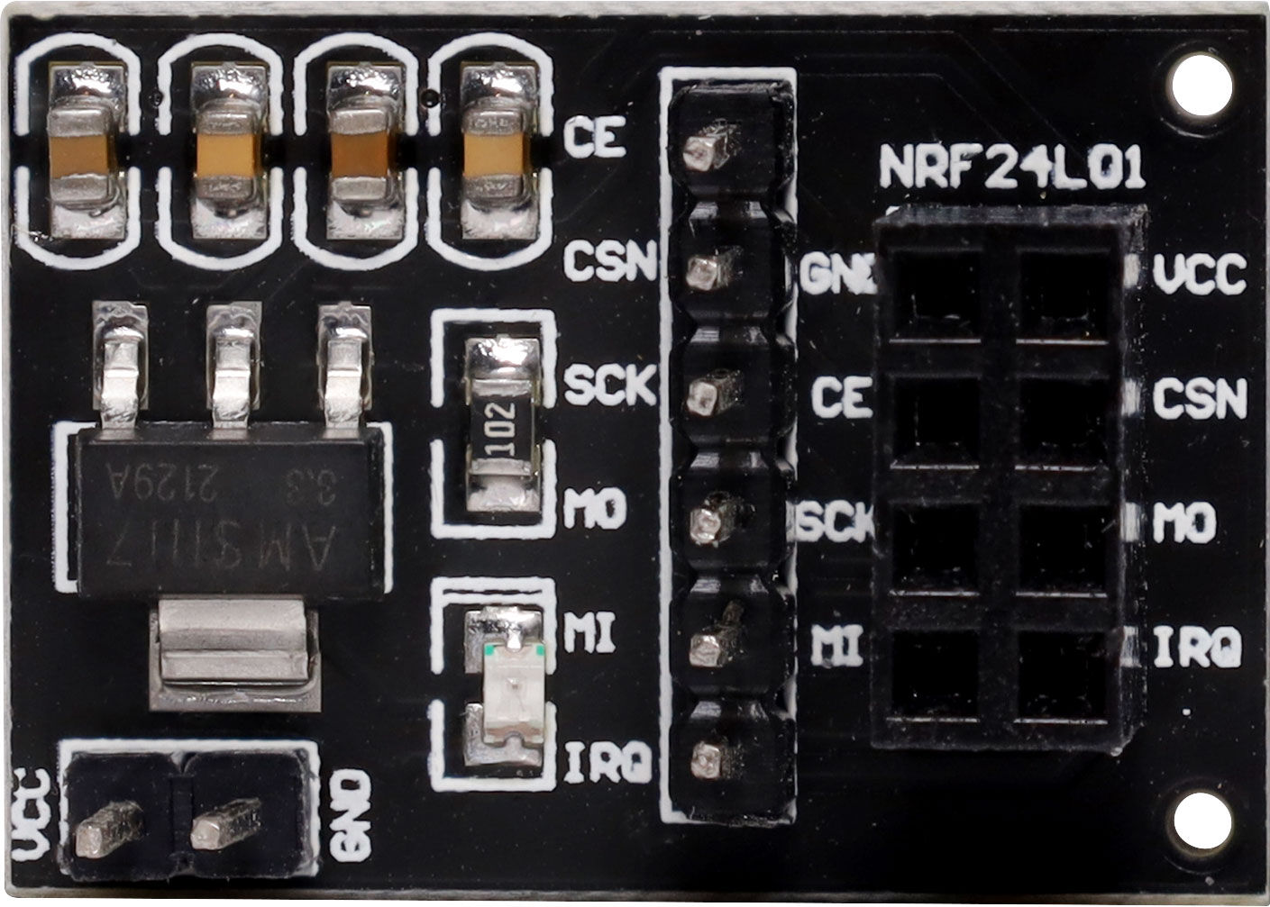 This module is a compact circuit board designed to simplify the integration of the NRF24L01+ or NRF24L01+PA+LNA wireless transceiver module with other electronic boards and project designs.To streamline connection, the adapter board includes a dedicated socket for the NRF24L01 module and a pin header to connection to a microcontroller, breadboard or other device.Equipped with the AMS1117 voltage regulator, the board provides a stable power supply to the NRF24L01 module. Additionally, built-in capacitors help reduce noise and improve signal quality, ensuring reliable wireless communication between the module and connected devices.