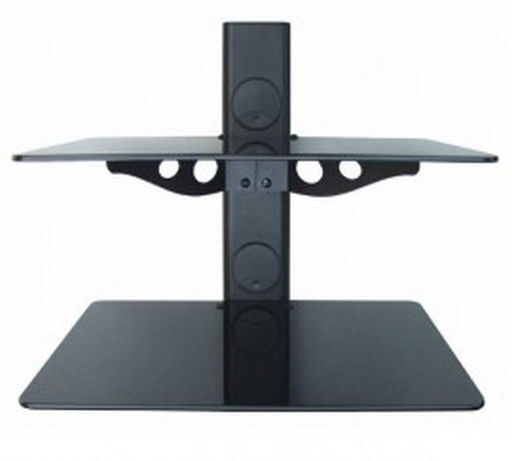 Single column universal wall mount with 2 glass shelves. This innovative storage system provides a sturdy bases for audio/video components and at the same time conceals all untidy cables under the TV. 350mm distance from the wall. 2 glass shelves can support up to 15 kg each. Size 460x440x320mm.