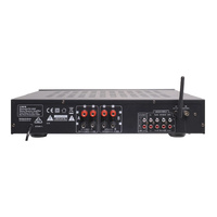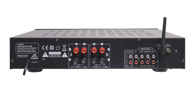 A stylish 2 x 100W (into 4?) FM stereo receiver with bluetooth audio streaming and a remote control. It features four stereo RCA inputs for CD, DVD, TV and Auxiliary. The large rotary dial controls volume, balance, bass and treble. The digital display tuner has precision push-button tuning and 30 memory presets for the FM radio band. FM tuner also offers RDS information. A-B speaker switch allows the amplifier to power two separate sets of stereo speakers in series - A or B or A+B. Pre-out function continues to operate when unit is in stand-by mode
