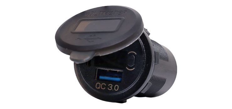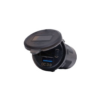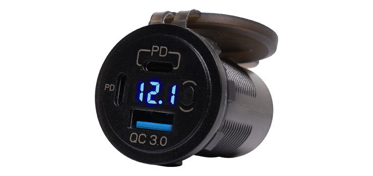 A dual-function car charger featuring Quick Charge 3.0 (18W) and 40W USB-C Power Delivery, perfect for cars, 4WDs, and caravans. Button on front panel can turn voltmeter on and off as desired.