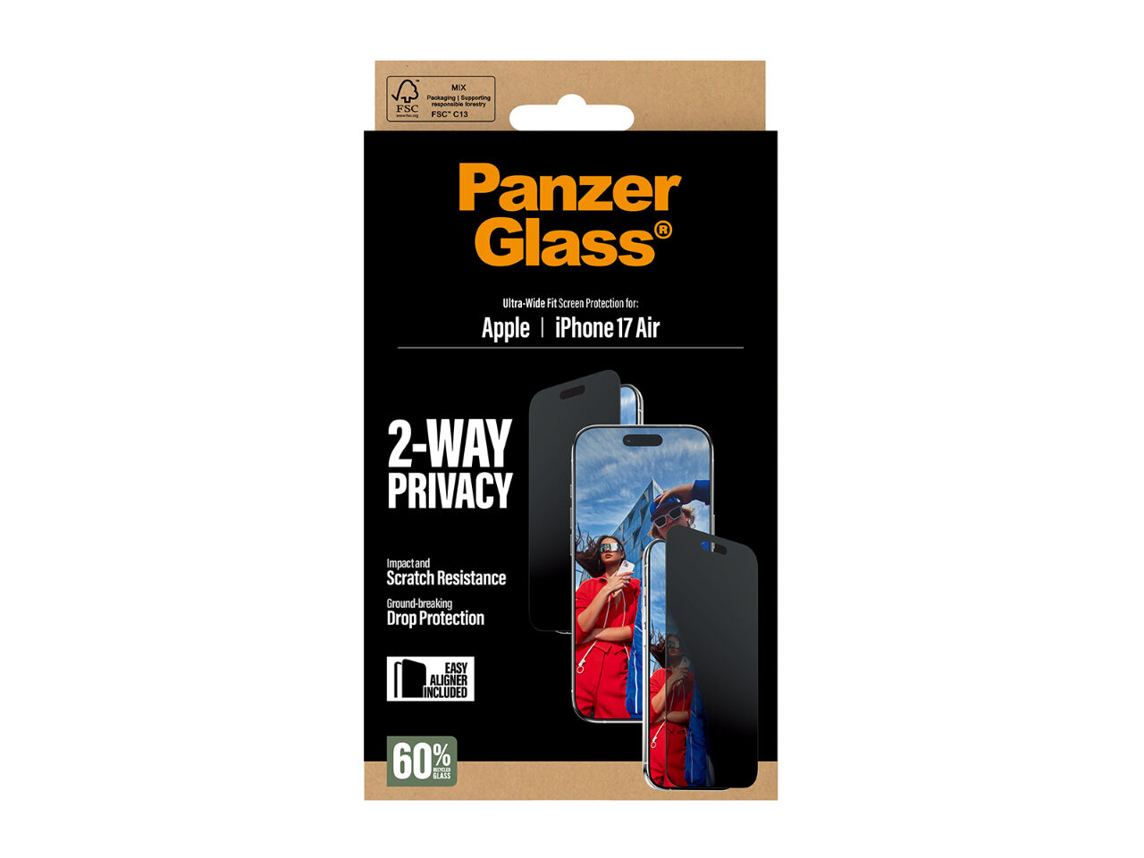Overview:Powerful meets privacy! With this PanzerGlass® privacy screen protector made of 60% recycled glass your personal info is safe from the prying eyes of people sitting next to you on the train in the coffee shop or at the office. The specially designed privacy filter renders the content of your screen virtually invisible to everyone except you. It even has a smudge-free coating that reduces traces of fingerprints and grease to give you a clear – but still private – view of your screen.And the screen protection? It’s outstanding! With high-level scratch resistance this screen protector shields your phone screen from accidental bumps crushing falls and other hazards of everyday life. Or to put it in more sustainable terms: It prolongs the lifetime of your phone postponing the need to produce new phones. This is one way of working toward a more sustainable future.|