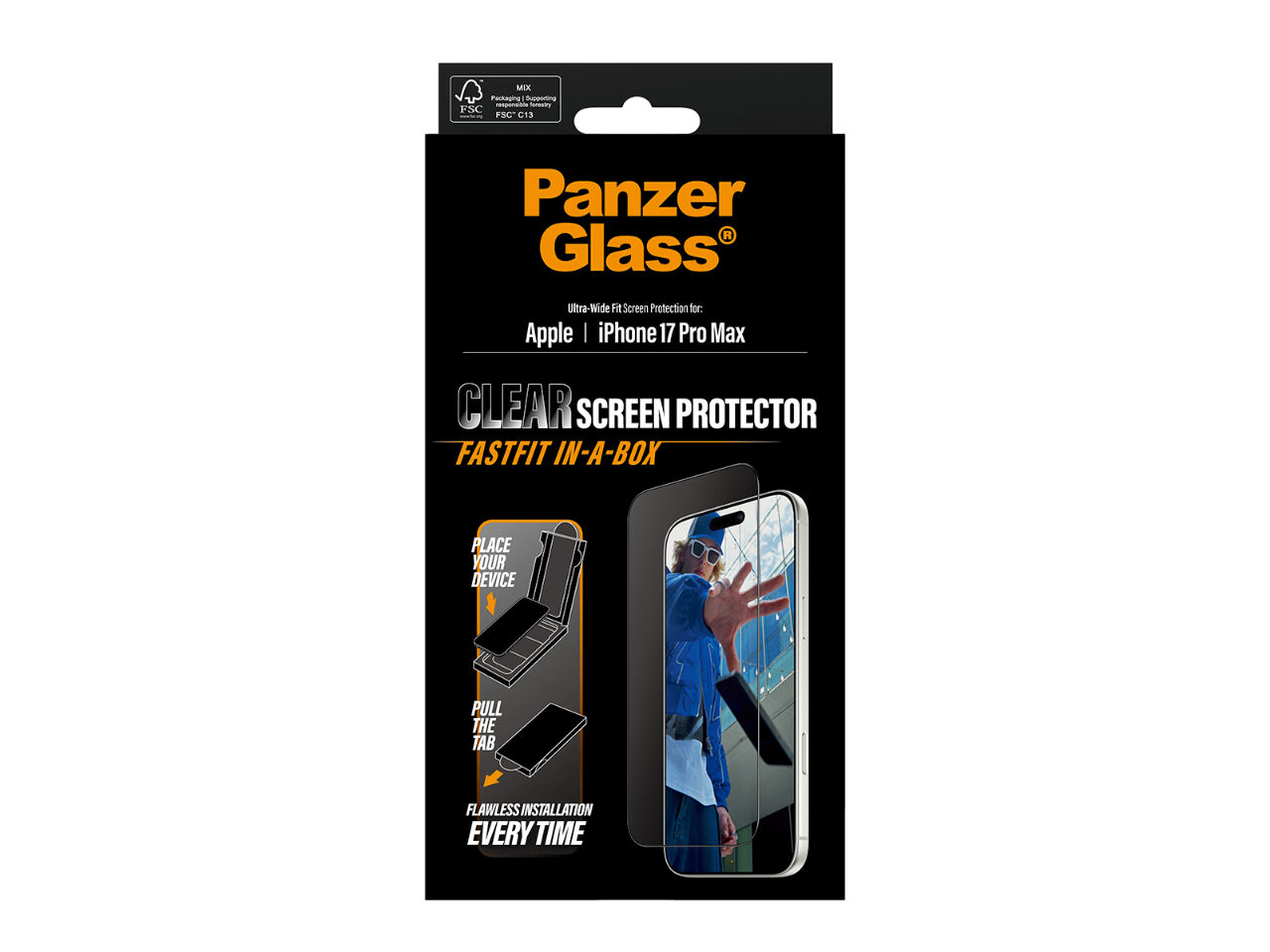 Overview:FLAWLESS INSTALLATION EVERY TIME. Installation has never been easier with the new FastFit In-a-Box system. Say goodbye to alignment issues and dust intrusion. Simply place your phone face-up pull the tab and enjoy a flawless installation every time.This PanzerGlass® screen protector made of 60% recycled material offers superior scratch resistance and outstanding shock protection. Protecting your phone from bumps drops and other everyday hazards with this screen protector built to withstand impacts of all kinds. It even comes with a smudge-free coating that reduces fingerprints and grease ensuring your screen stays crystal-clear.With an Ultra-Wide Fit this screen protector covers the front surface of your phone while making room for a case. For full protection pair the screen protector with PanzerGlass® PicturePerfect or Hoops® camera lens protector and a case from CARE by PanzerGlass|