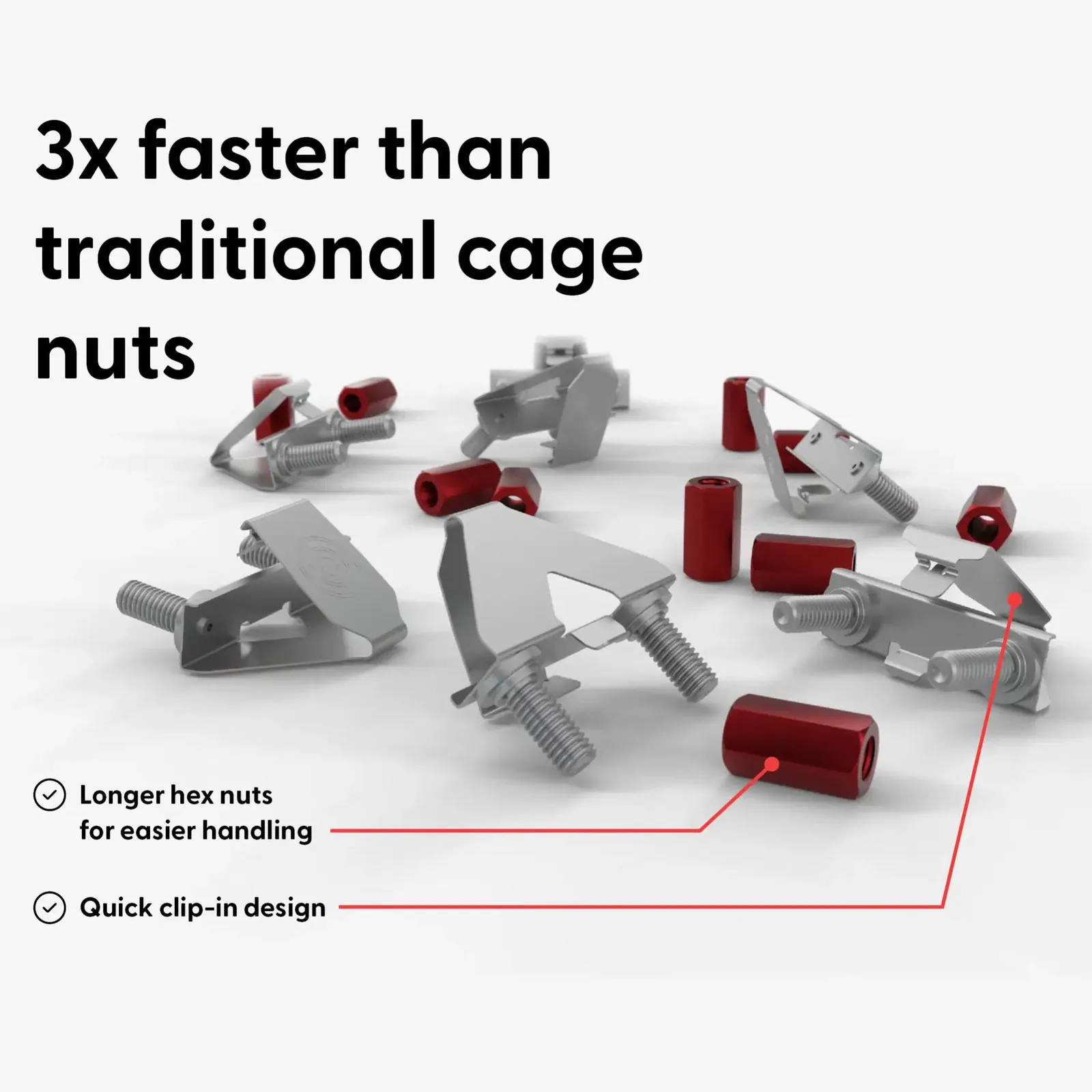 Patchbox /dev/mount 50-Pack, 1RU Toolless Cage-Nut alternative, Supports Components Up To 200KG (Depends on Depth).Replace your conventional cage nuts with our easy and pain-free /dev/mount, an innovative cage nut alternative. No tools or prior assembly are required for our /dev/mount and no sharp edges need to be touched. Device mounting has never been easier, faster, and safer before.It is compatible with all 19 rails with square punched holes.With the /dev/mount 50-pack, you can fill up to 25 RU, and it comes with longer hex nuts for easier fastening.