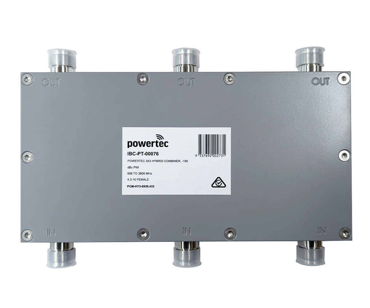 Hybrid Couplers are used to develop advanced RF transmission systems where interaction-free signal combining is required. While rare, 3x3 couplers are occasionally used as an means of combining three radios or repeaters onto three distribution paths. The unit has three input ports which feed three coupled output ports. This 3x3 Hybrid Coupler has been developed for use as a 4G-5G MNC in passive in-building coverage systems, along with supporting high powered defence and aerospace technologies. The unit supports a wide frequency range from 700 to 3800 MHz, extremely low intermodulation with a -155 dBc PIM rating, and using latest generation 4.3-10 connectors.