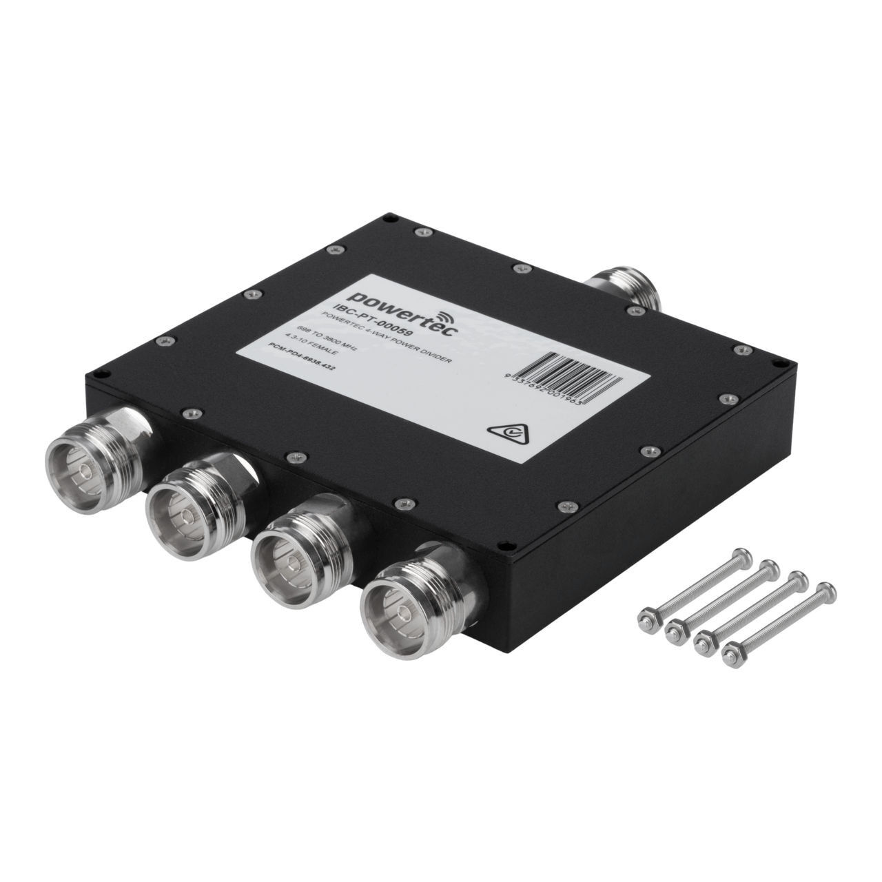 The Powertec RF Power Divider 4-Way is designed to split one input signal into four equal outputs across the 698 to 3800 MHz frequency range. It provides consistent performance for wireless, RF, and microwave systems, making it ideal for larger networks and advanced communication infrastructure.