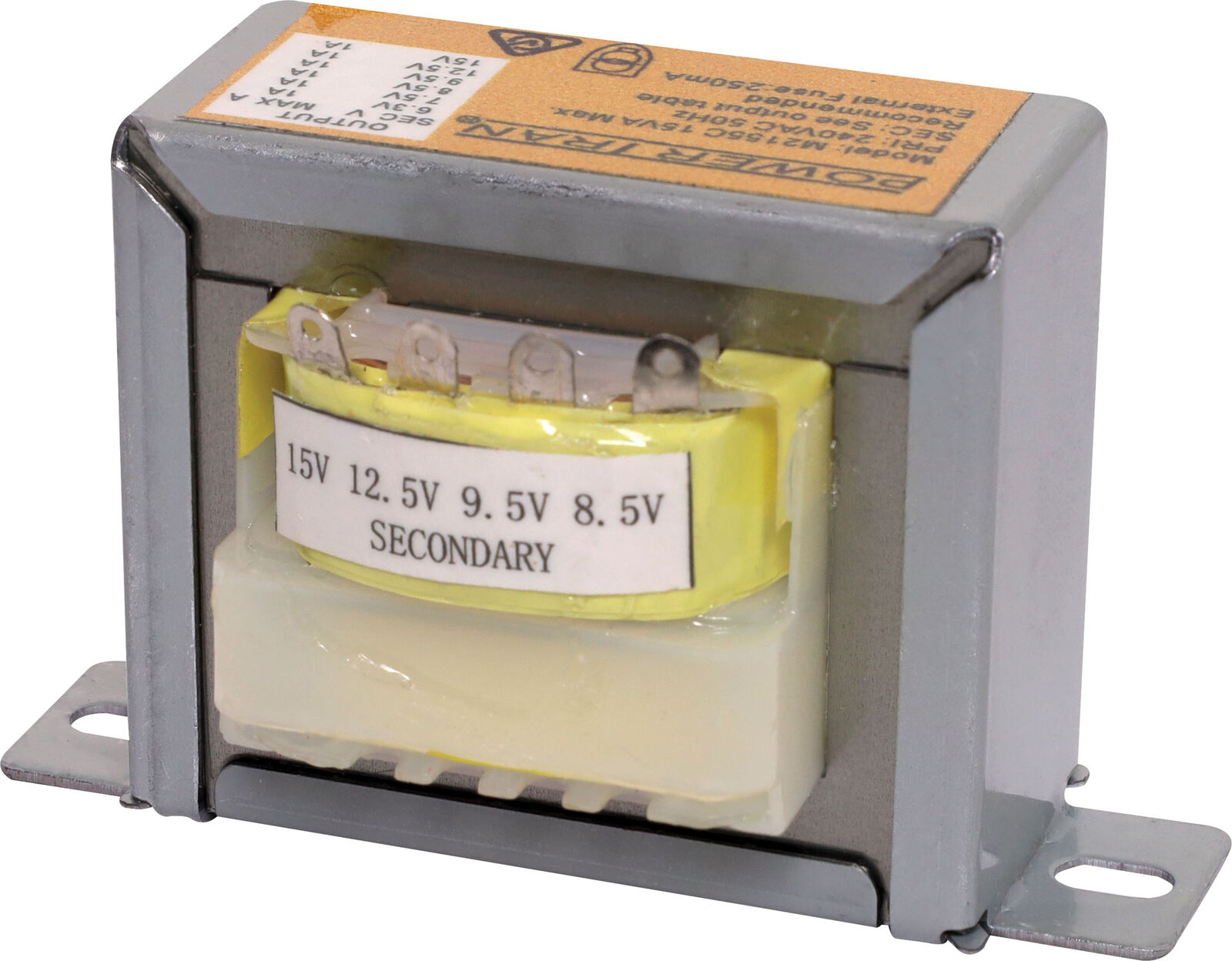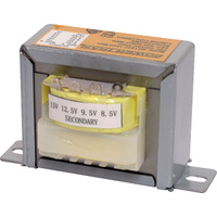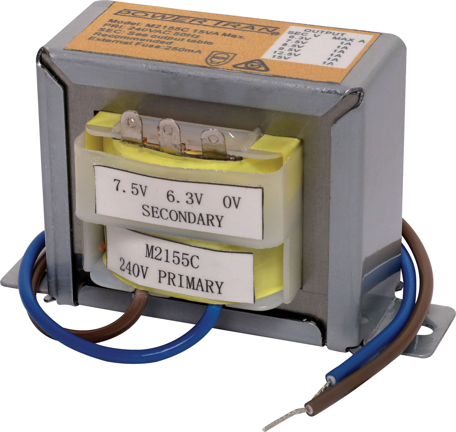 Powertran EI-Core 240V AC mains transformer with 1A multi tapped secondary configuration. 0V, 6.3V, 7.5V, 8.5V, 9.5V, 12.5V and 15V secondaries are available at 1A current output. Primary is fitted with 200mm fly leads. Secondary taps have solder tags. Fully electrical authority approved for AS/NZS 61558.2.6.