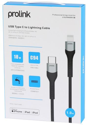 Prolink PF444A-0100 is a 1M USB Type-C to Apple Lightning charging cable. Apple MFI certified. It features a built-in Apple’s C94 chip to support high power charging at up to 18W. Fully compatible with USB-PD and QC charging protocols. This cable allows you to take full advantage of fast charging your iPhone XS Max, XS, XR, X, 8 Plus, 8 and later models using the 18W Apple USB-C power adaptor. In addition, this cable is protected by a sturdy layer of braided nylon. The reinforced joint has been thoroughly tested in laboratory environment to withstand against breakage.