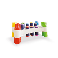 The child can strike the colourful nails with a solid plastic hammer and express themselves freely. With just one foot under the game, the nails touch the surface underneath and will not fall out. Just turn the game over and start again. With two feet on top of each other under the game, the nails will fall to the ground. The child can put them back into the holes and start striking them again.
