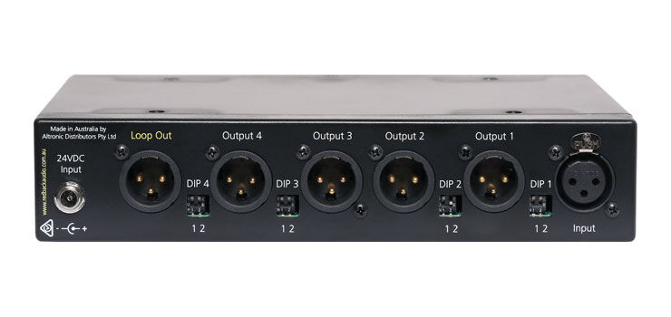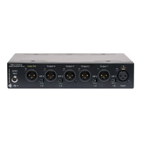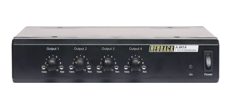 This compact half rack distributor comprises of a single 3 pin balanced XLR input to four 3 pin balanced XLR outputs. Great for splitting a single audio source out to multiple zones without interference between channels. The input and all outputs can be configured individually for either mic or line level operation. Front panel volume and recessed treble and bass controls are provided for each output. A loop output 3 pin XLR socket is provided to connect additional units to increase the total number of outputs as required. It is housed in a half rack 1RU cabinet and powered by 24V DC power source (power supply included).