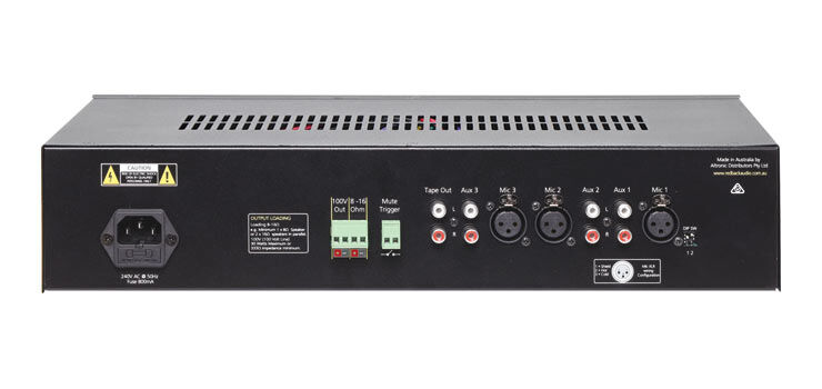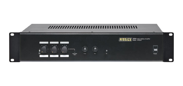 A staple of the Redback range since we first started, the 30W amplifier meets the requirements of small to medium public address installations. Features push to talk (PTT) auxiliary muting, three combined balanced microphone / stereo line inputs, tape out, and separate bass and treble controls. Offers a wide scope of installation applications, including schools, public halls, workshops and sporting complexes. Output may be 100V line or low impedance (8 - 16?) speaker loads. This unit features thermal overload shutdown, over current and short circuit protection.