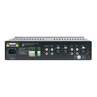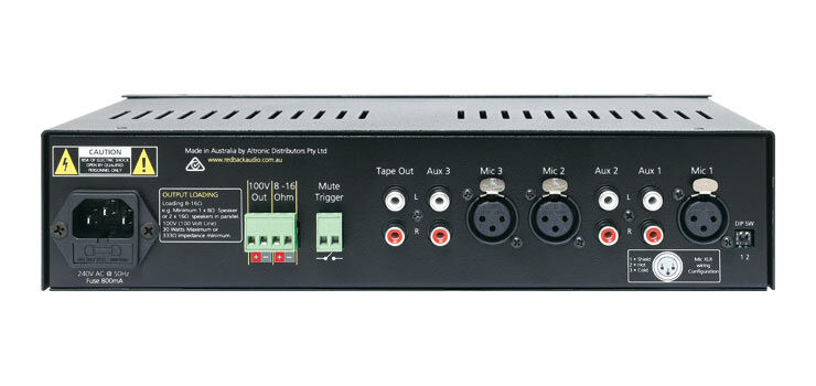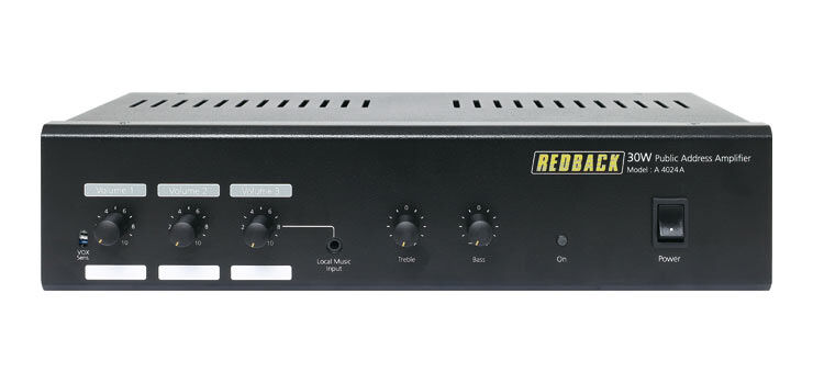 A staple of the Redback range since we first started, the 30W amplifier meets the requirements of small to medium public address installations. Features VOX muting, three combined balanced microphone / stereo line inputs, tape out, and separate bass and treble controls. Offers a wide scope of installation applications, including schools, public halls, workshops and sporting complexes. Output may be 100V line or low impedance (8 - 16?) speaker loads. This unit features thermal overload shutdown, over current and short circuit protection.