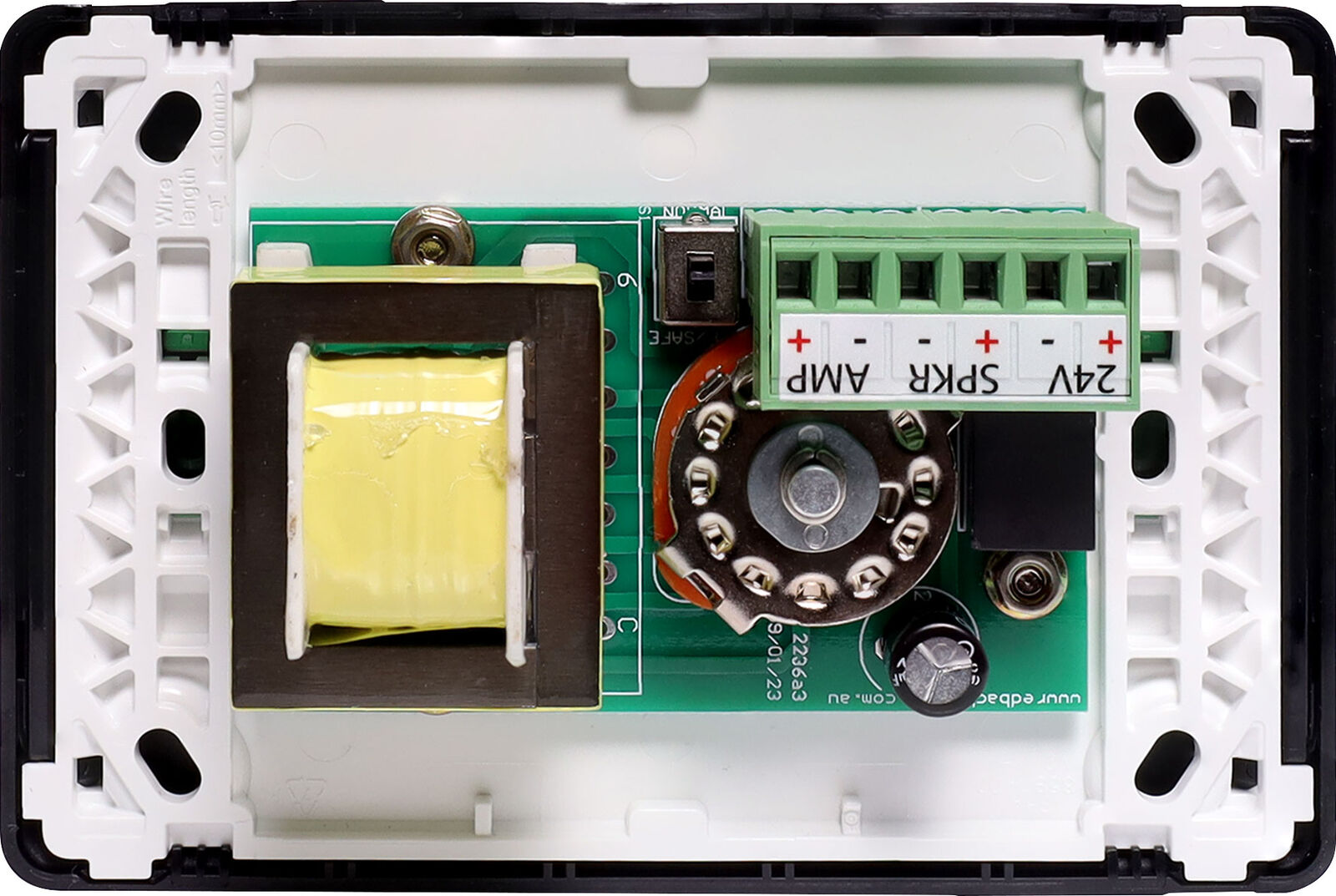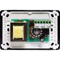 This 10W volume control is designed for 100V line speaker systems. The volume control is fitted to a white Clipsal Pro Series wall plate which has been specifically designed for commercial building installations. They feature 11 position switches for fine adjustment of sound level. All circuitry is housed on a PCB with screw terminals for easy installation. They include override relay for emergency paging applications & a 22µF bipolar capacitor for line monitoring purposes. An onboard switch selects between normal and failsafe modes. With the switch in the Normal position energising the override relay (24V DC to the 24V DC terminal) bypasses the controller. Full input power is directed to the speaker load. De-energising the override relay configures the unit to normal level control function. With the switch set to the Failsafe position energising the override relay is necessary for normal level control function. De-energising the override relay bypasses the controller. That is, full power is directed to the speaker load.