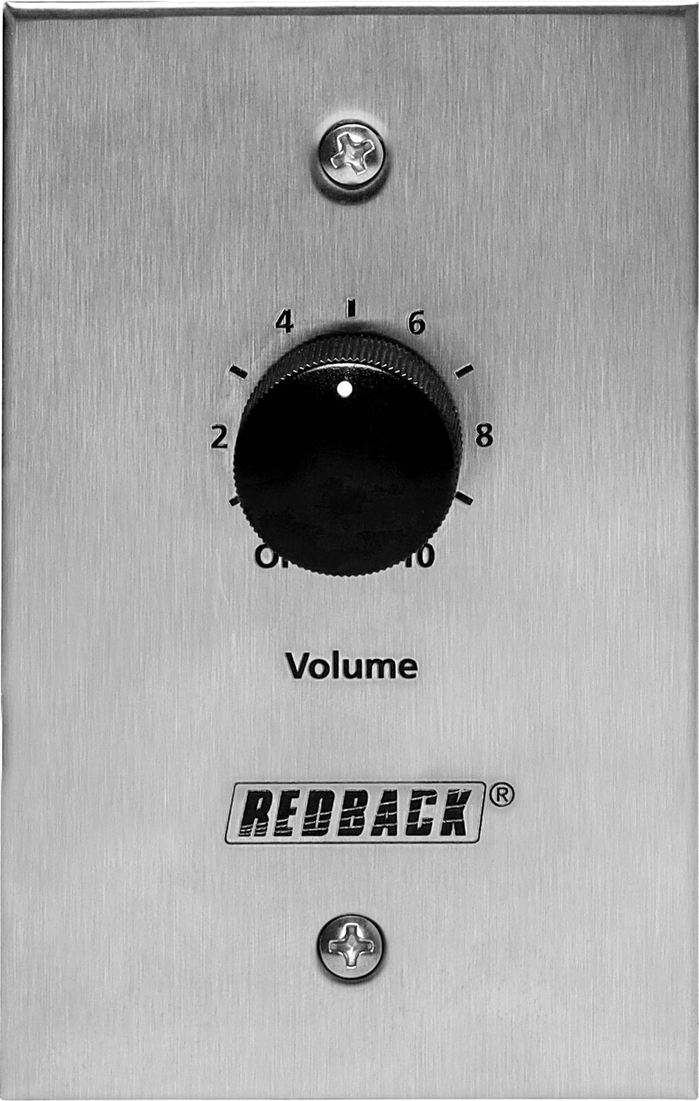 A stainless steel version of our popular Redback 10W volume attenuator. Designed to control 100V line speaker systems these attenuators are fitted to industry standard wall plates and install into an electrical wall box. They feature 11 position switches for fine adjustment of sound level. All circuitry is housed on a PCB with screw terminals for easy installation. They include override relay for emergency paging applications & a 22µF bipolar capacitor for line monitoring purposes. An onboard switch selects between normal and failsafe modes. With the switch in the Normal position energising the override relay (24V DC to the 24V DC terminal) bypasses the controller. Full input power is directed to the speaker load. De-energising the override relay configures the unit to normal level control function. With the switch set to the Failsafe position energising the override relay is necessary for normal level control function. De-energising the override relay bypasses the controller. That is, full power is directed to the speaker load.