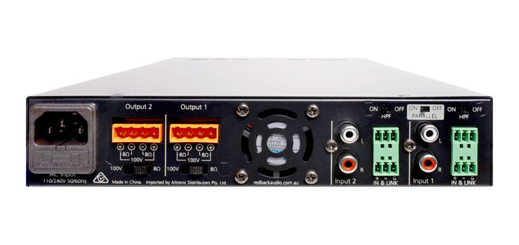 This 2 x 60W PA zone amplifier developed by Redback, allows installers to mix and match amplifiers within a 1RU 19 rack space. For instance an installer could mount this 2 x 60W amplifier for a lower wattage zone, plus a 1 channel 120W amplifier - all within a single unit of rack space! This offers flexibility for installers, allowing the installation of zone amps to closely match the requirements of the customer. Each amplifier is a Class-D design offering high performance in a compact space, with excellent power efficiency. The front panel offers adjustment for each channel plus bass and treble control. Individual protection, clipping and signal presence indicators are provided for each channel. All outputs are via pluggable euroblock connectors with 100V line and 8? outputs available. Inputs are via stereo RCA line or balanced euroblock pluggable screw terminals. A high pass filter switch can be activated on each channel. For installations using only one amplifier, a mounting bracket adaptor provides an easy way to bolt into a standard 19 racking system.