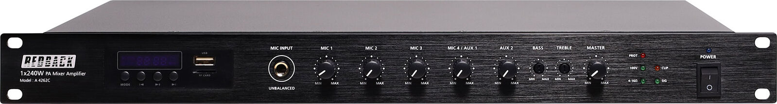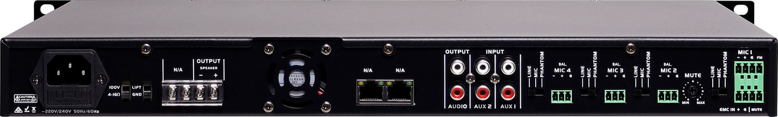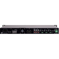 Screw terminal connections are provides for balanced inputs sources and 100V output. A stereo RCA line output is provided, plus two stereo RCA line inputs. Inputs 1 - 4 have switches to select mic or line operation and phantom power on/off. A top priority emergency input is also provided which can be connected to an alert/evac tone generator. Music playback is easily managed via the front panel track selection and play/pause controls. Music files can be stored and played back from SD card, USB memory stick or Bluetooth enabled device. Dimensions: 484W x 330D x 44Hmm.