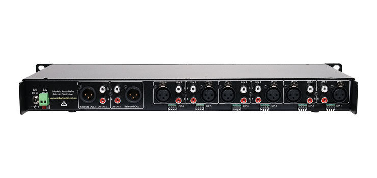 This Redback PA mixer incorporates six inputs which can be routed to 1 of 2 outputs or both as the installation requires. Inputs can be configured for either RCA line level signals or 3 pin XLR balanced mic signals. Outputs are via RCA and 3 pin XLR balanced 1V signals. Front panel controls including volume, treble and bass are included for each input. Independent master volume controls are provided for each output. Pushbutton switches are provided to enable inputs to be switched to either output 1, output 2 or both outputs 1 and 2. DIP switches allow for each input sensitivity to be set to 100mV and phantom power on/off, and choice of RCA or XLR connection for that chosen input. All housed in a low profile 1RU 19 rack mountable case.