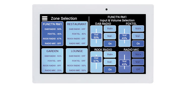 This 7 Inch touchscreen control wall plate allows for remote source selection and level control in Redback source control systems (currently compatible with A4450, A4460 and A4650 systems). This plate is a master level controller allowing selection of inputs and volume for all zones in the system. The settings menu allows for selection of button colour theme and renaming of zones and inputs in the system, plus various settings for haptic button feedback, screen sleep etc. For more information on how this plate operates with each system, see the relevant pages for A4450, A4460 and A4650.