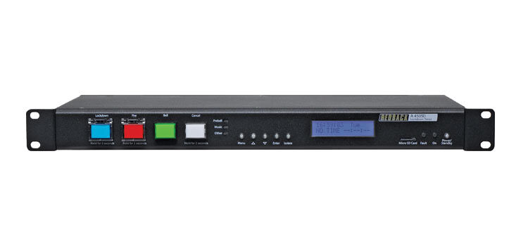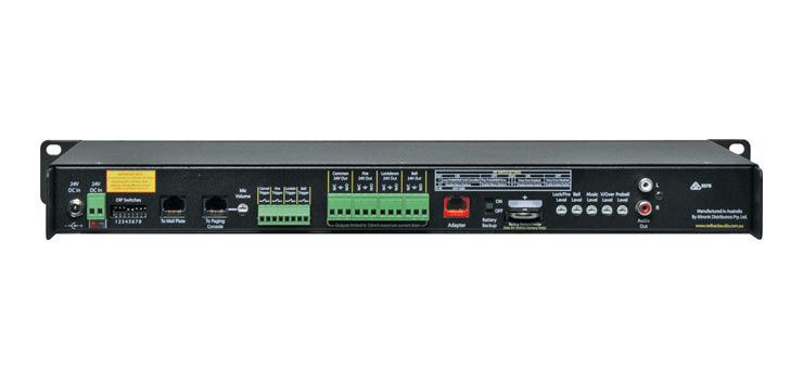 A weekly timer and Lockdown and Fire Alarm controller all housed in a convenient 1RU rack mount chassis. A total of 50 event switching times are available through the timing functions. Each event can be set to turn on any single day of the week or on multiple days, from 1 sec up to 24 hours. When a timing event is activated, an audio file will be played and output through the RCA line level output. There are one 99 audio playback options for the timing events, which include the Bell, Prebell, Music and outputs 5-99. A Micro SD card which is supplied, houses all the audio files to be played as well as storing all the timing events. The timing events can be programmed via the units front buttons or they can be programmed with the supplied PC software.