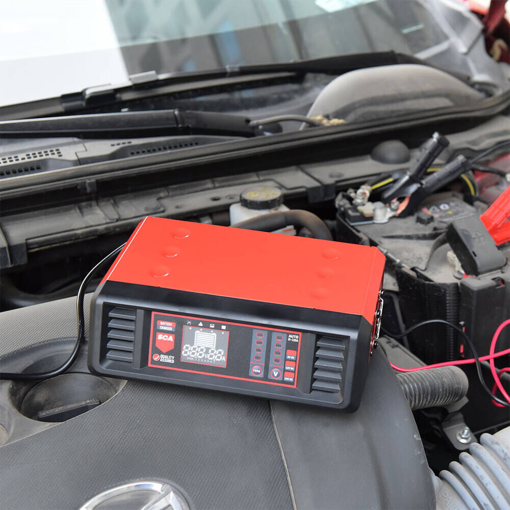 Elevate your battery care routine with the SCA 6V/12V/24V 10 Amp Battery Charger, a powerful solution for all your charging needs. Boasting a maximum charging capacity of 110Ah/1100CCA and maintenance prowess up to 220Ah/2200CCA, this charger ensures your batteries are always operating at their best. Its versatility shines through with compatibility for 6V, 12V, and 24V batteries, accommodating a wide range of automotive battery types including Gel, Lead Acid, AGM, Maintenance-Free, Calcium, and Lithium LiFePO4.