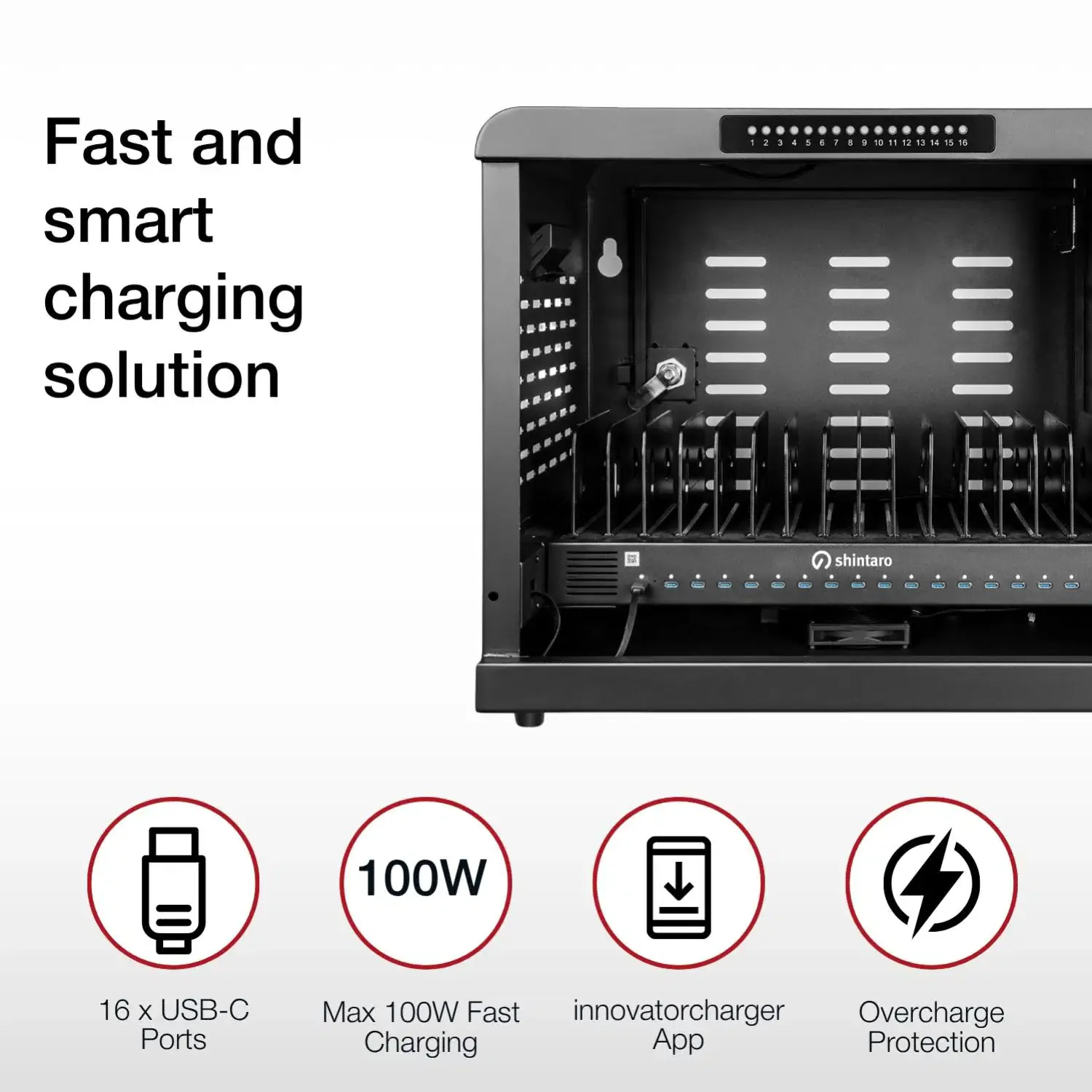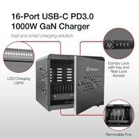 Shintaro 16-Port USB-C PD3.0 1000W GaN Charging Cabinet for Smartphone, Tablet, & Notebook Devices & Smart Power Management via Innovate Charger App.The Shintaro USB-C Charging Cabinet delivers high-powered, secure, & flexible device management-purpose-built for large-scale deployments-incl. education, government, corporate, enterprise, healthcare, retail & hospitality sectors. Equipped with 16 USB-C PD3.0 ports delivering a combined output of 1000W, charge up to 10 laptops at 100W or 16 devices at 60W. Fast charges iPhone, iPad, MacBook, smartphones, tablets, notebooks, laptops, & Chromebook devices up to 16.The innovatecharger app offers versatile, intelligent, real-time monitoring & remote control of all connected charging cabinets, with support for multiple languages.
