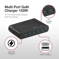 Experience fast and efficient charging with the Shintaro 150W GaN charger, designed for easy access on your desk. With 5 USB-C and 5 USB-A ports, this powerful charger accommodates a wide range of devices, including MacBook, iPhone, iPad, and other USB-C smartphones and tablets. Featuring advanced GaN technology for high wattage and intelligent power sharing, it ensures optimal charging for up to five devices simultaneously. This centralized charging solution is perfect for home, office, or on-the-go use, combining performance and convenience in one sleek design.