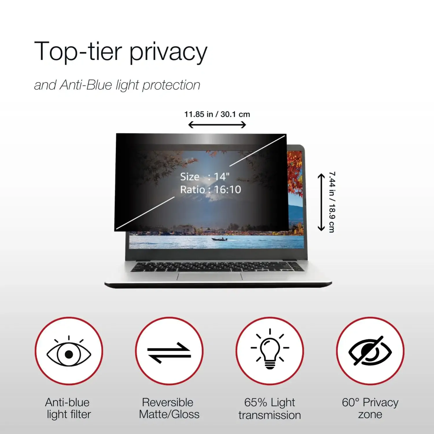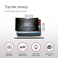 Keep your work secure and your eyes comfortable with the Privacy Screen Filter.With 65% light transmission, this black filter is perfect for laptops and smaller displays, blocking side views and reducing glare in bright conditions.Blue light reduction technology helps minimize eye strain,making it ideal for professionals working long hours on the go.Upgrade your display with superior privacy and eye protection.
