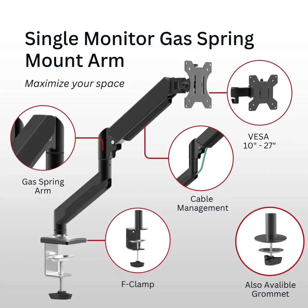 Shintaro Single Monitor Mount for Up to 32  Screen, Gas Spring Arm, C-Clamp, Tilt, Height, 10kgs Max Load Weight.Gas spring Single Monitors Desktop Bracket. Both desk clamp and grommet are included
