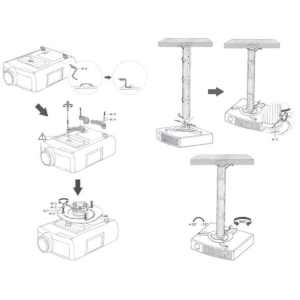 Aluminium ceiling projector bracket. -15° to +15° tilt, 360° horizontal rotation. Includes extension pieces to achieve height from 130mm to 1060mm drop. Mounting Range: 130~320mm. Includes cable through hole.