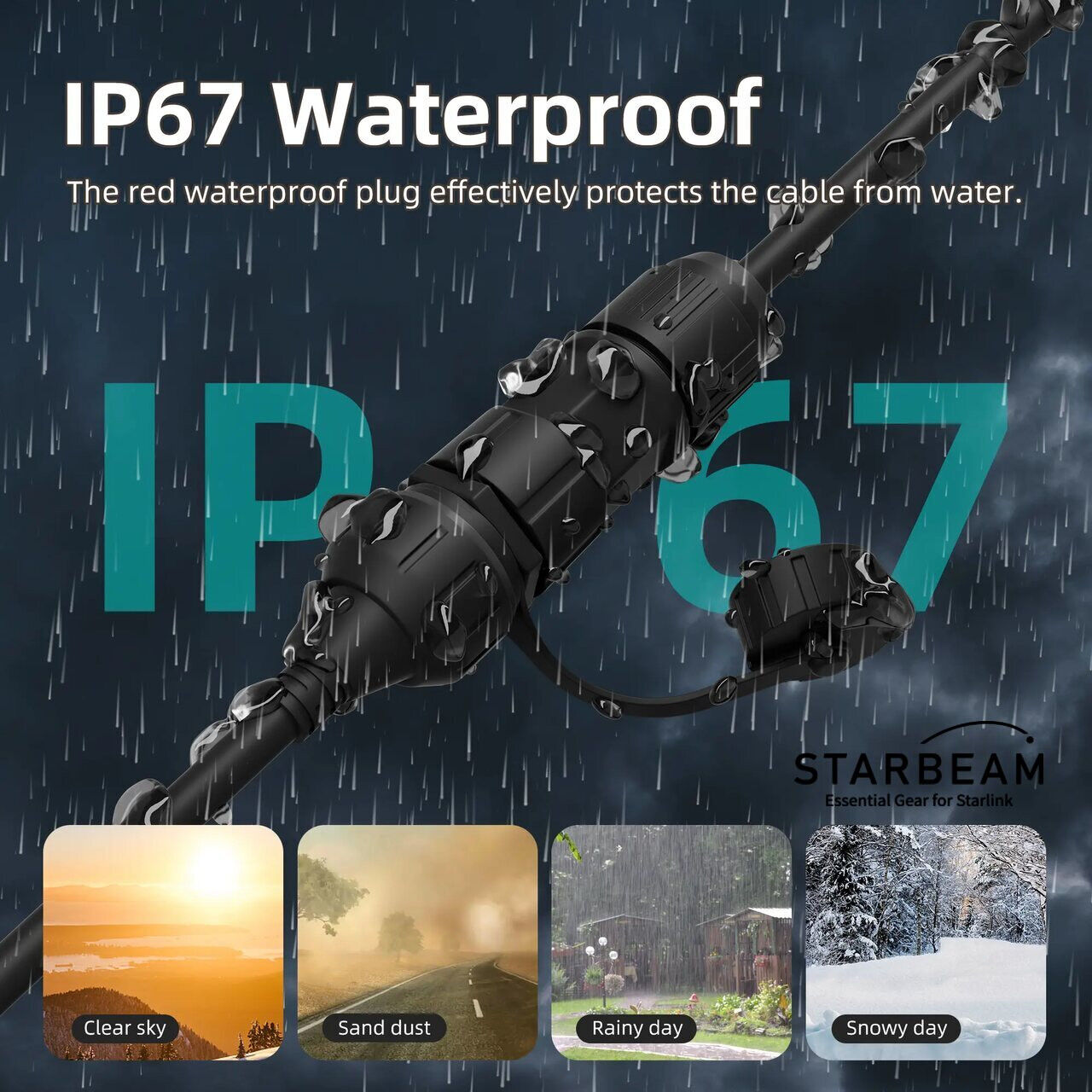 • IP67 Waterproof Rating: Features a robust, waterproof design with red waterproof plugs, protecting connections from water, dust, and environmental elements, ensuring reliable performance in various conditions.