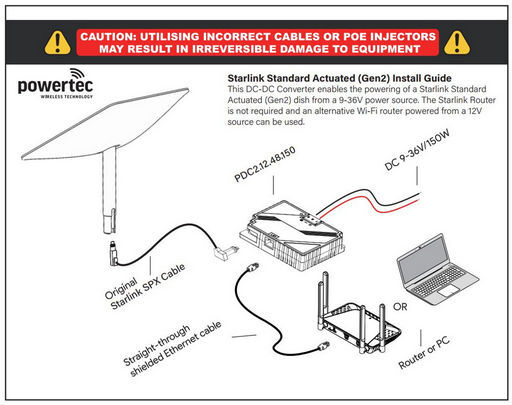 The Powertec Starlink Gen2 DC/DC Converter enables you to power a Gen2 Actuated Starlink dish from 9-36V DC, making it perfect for off-grid setups in vehicles, caravans, motorhomes, homes, and solar installations. By using DC power instead of AC via an inverter, you can reduce power consumption by up to 15%, which is especially valuable for battery-powered off-grid applications.
