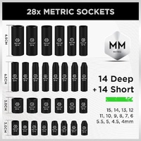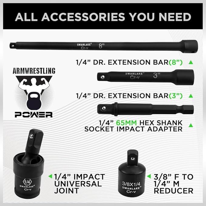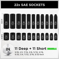 • Product specification includes 1/4-Inch Drive Ratchet Handle, 3" and 8" drive impact extension bar, 1/4" universal joint, 3/8" to 1/4" reducer and the following socket sizes: SAE, Deep: 5/32, 3/16, 7/32, 1/4, 9/16, 9/32, 5/16, 11/32, 3/8, 7/16, 1/2, 9/16 (inches), Shallow: 5/32, 3/16, 7/32, 1/4, 9/16, 9/32, 5/16, 11/32, 3/8, 7/16, 1/2, 9/16 (inches) ,Metric Sizes: Deep: 4, 4.5, 5, 5.5, 6, 7, 8, 9, 10, 11, 12, 13,14,15mm, Shallow: 4, 4.5, 5, 5.5, 6, 7, 8, 9, 10, 11, 12, 13,14,15mm