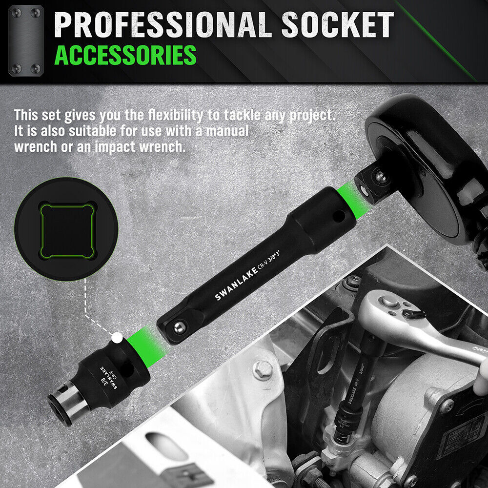 【Material】:The impact extension socket set is made of Heavy-duty Chrome-Vanadium steel alloy,durable and hard to use,a corrosion-resistant black phosphate finish.
