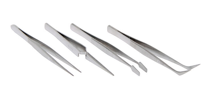 This handy 4 piece precision tweezer set includes reversible action (normally closed), curved needle point, curved flat point and straight needle point tweezers