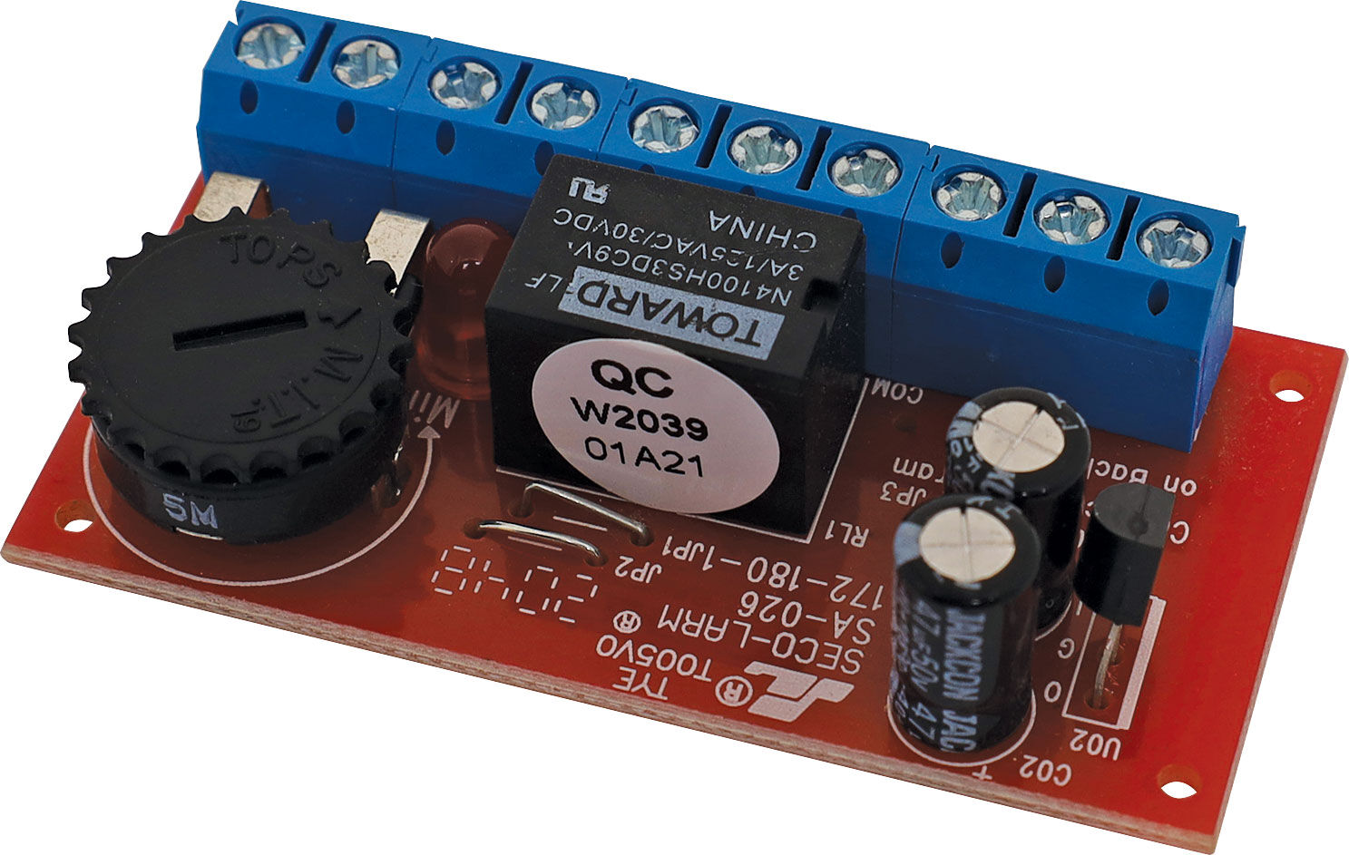 The SA-026Q low voltage miniature timer module operates on 12-24V AC or DC. It may be used to modify the activation time of a momentary contact switch for 1-180 seconds, adjustable via onboard variable resistor. May be triggered by a NC or NO contact. Switched power output, plus voltage free changeover relay contacts.