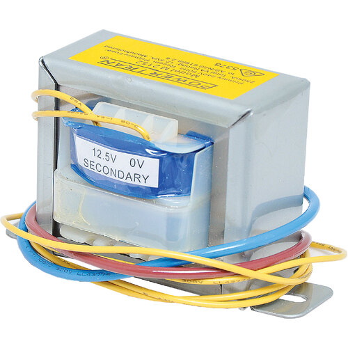 Powertran EI-Core 240V AC mains transformer with a 12.5V secondary voltage and 1A current output. Primary and secondaries fitted with 200mm fly leads. Fully electrical authority approved for AS/NZS 61558.2.6.