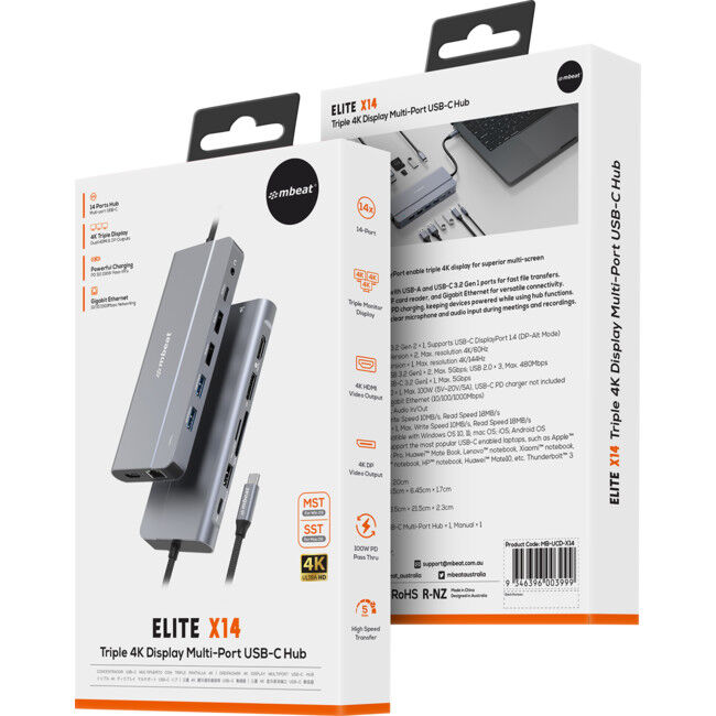 The mbeat Elite X14 multi-port USB-C hub offers triple 4K display support, fast data transfer, versatile connectivity, 100W pass-through charging, and built-in audio support, making it a comprehensive and efficient multi-port USB-C hub for all your needs.