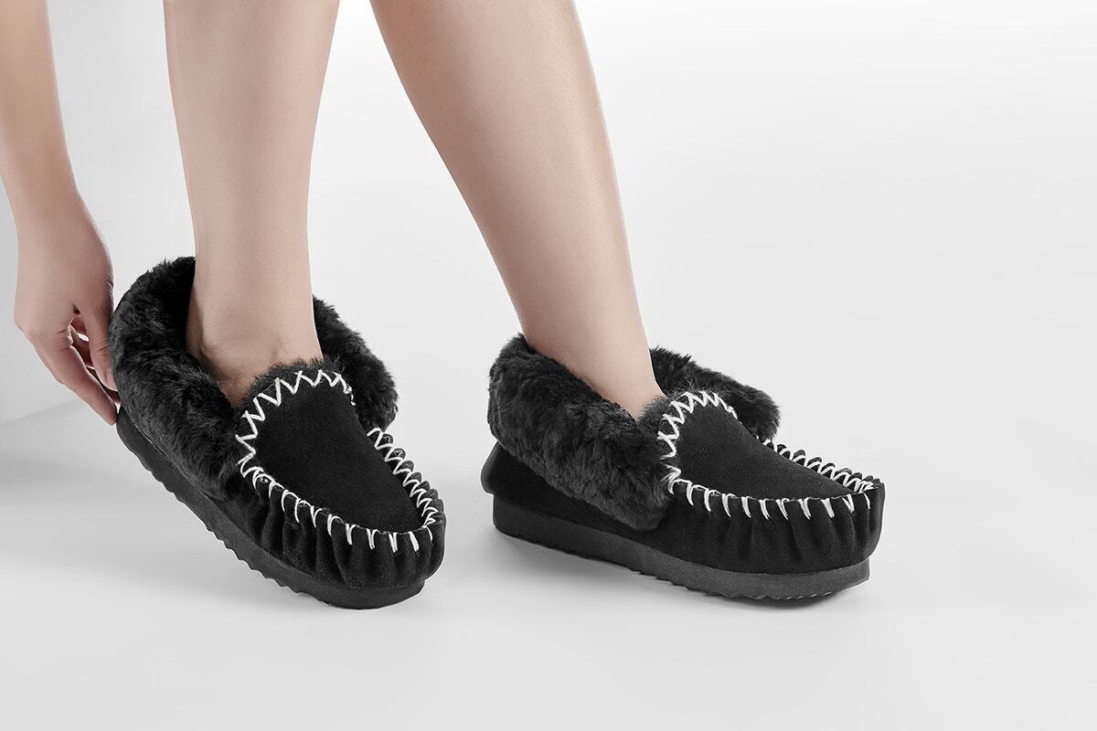 These moccasins are very comfortable and will keep your feet warm. They are made of 100% Australia sheepskin and have a breathable wool lining. They also have a supportive non-slip sole that is suitable for indoor and outdoor use. You can wear them indoors or outdoors and they are perfect for a gift.