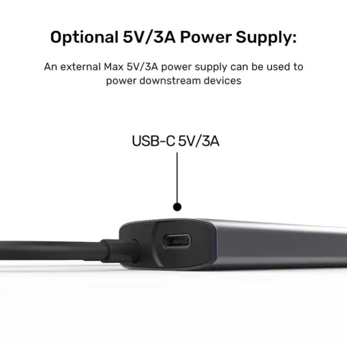 • An external Max 5V/3A power supply can power downstream devices connected to the USB 10Gbps hub.