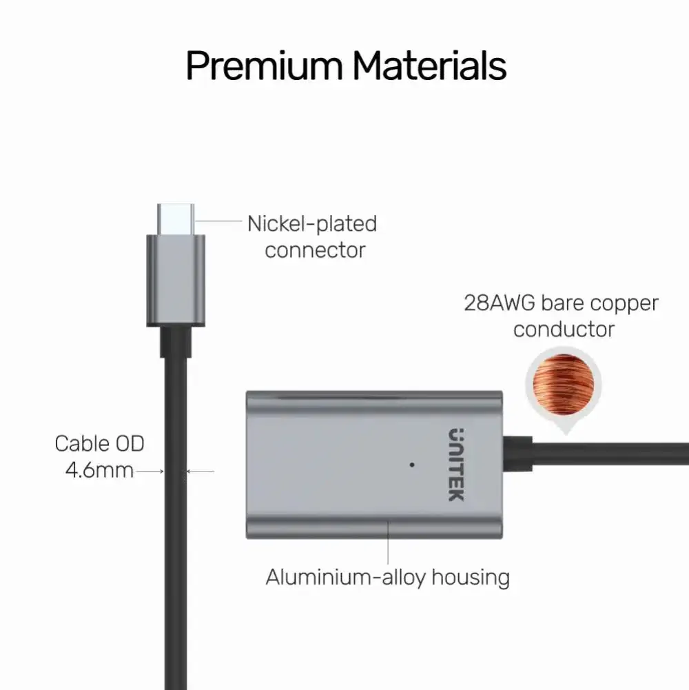 Unitek 5M USB Type-C Active Extension Cable, Grey, Unitek Gift Box