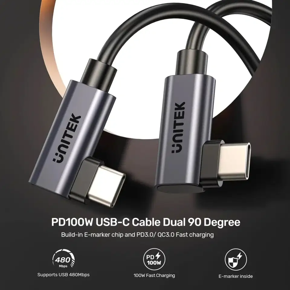 UNITEK USB-C to USB-C cable supports up to 100W of power with a built-in E-marker chip, delivering a maximum current of 5A. It is compatible with PD 3.0 and QC 3.0 for fast charging.UNITEK USB-C to USB-C Dual 90-Degree cable supports a 100W (20V 5A) power adapter. The unique design of dual 90-degree connectors allows for easier access and reduced strain on the cable, making it perfect for tight spaces and angled connections.