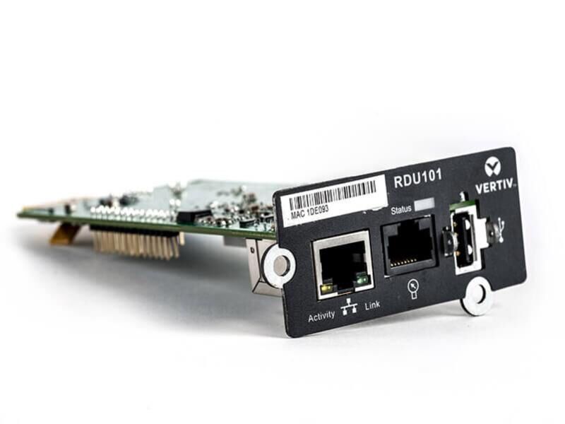 The Vertiv Liebert IntelliSlot RDU101 Network Card (RDU101) provides web access to Vertiv Liebert GXT5 UPS. This network card supports third-party protocols via SNMP for interfacing with building management or data center management system applications.