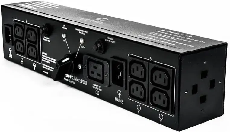 Vertiv Liebert MP2-220L Micropod Maintenance Bypass for GXE3 & GXT5-3000IRT2UXL UPS (3000VA), 6x IEC 60320 C13, 1x C19 BOX DAMAGE.The Vertiv Liebert MP2-220L Micropod maintenance bypass and Power Output Distribution (POD) switch allows you to manually transfer the connected equipment to utility power via a maintenance bypass switch, permitting scheduled maintenance or UPS replacement without discontinuing power to the critical load. it is designed for Liebert GXE3-3000IRT2UXL and GXT5-3000IRT2UXL.