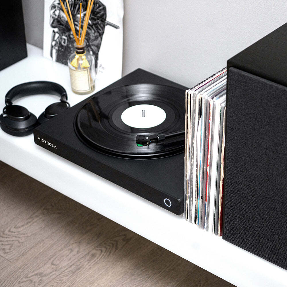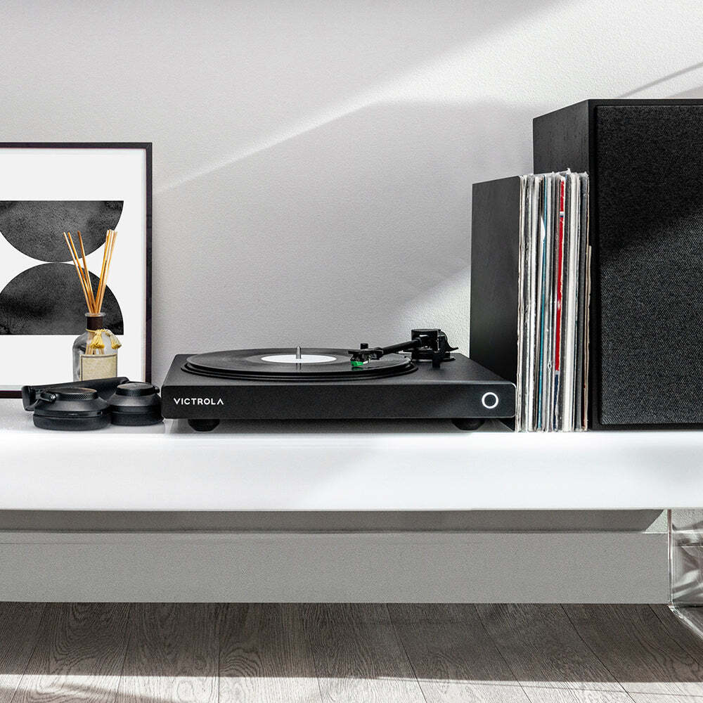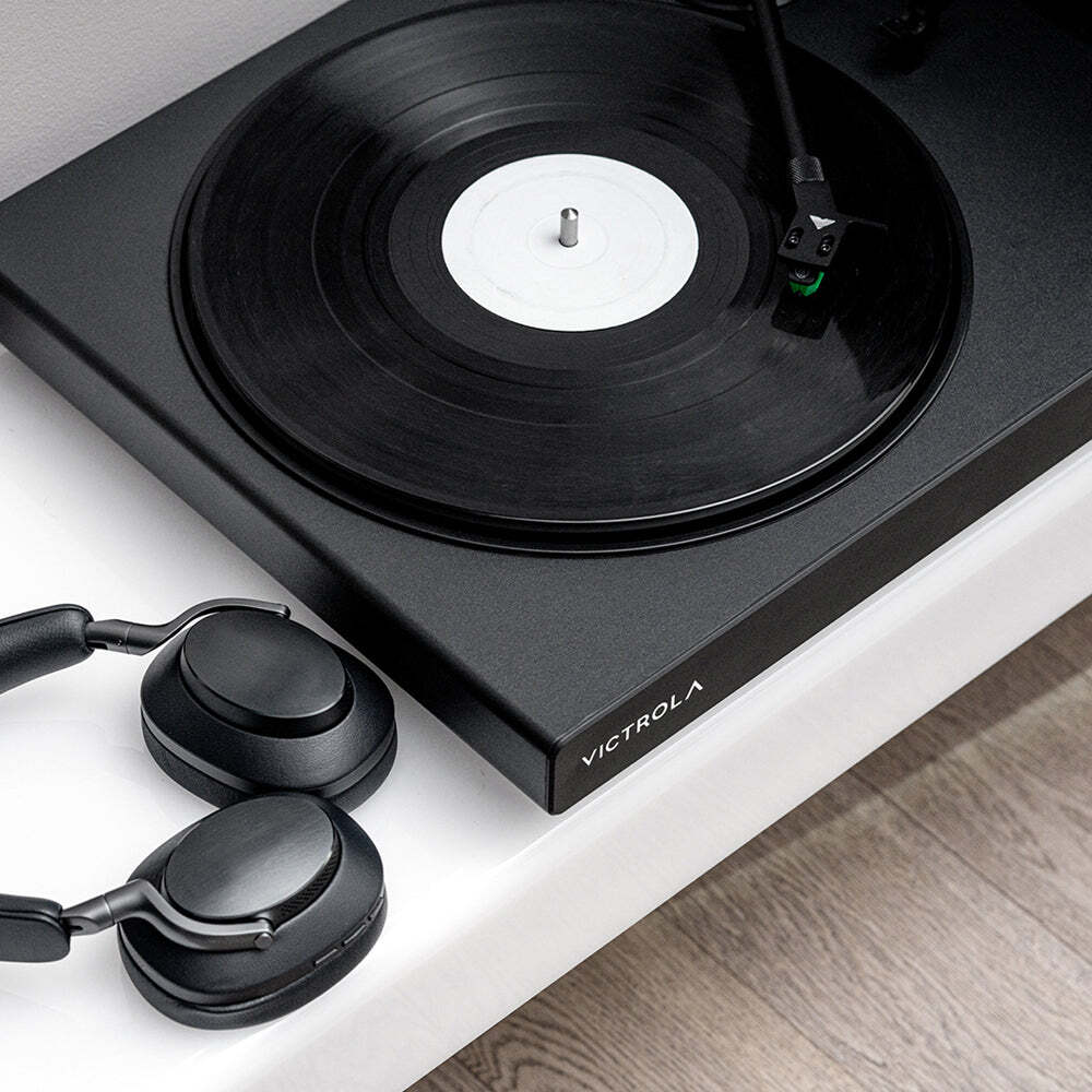 Victrola Hi-Res Onyx INT Turntable - Immerse yourself in the rich, authentic sound of vinyl records with the Victrola Hi-Res Onyx turntable. Experience the freedom of wireless connectivity with top-of-the-line aptXª Adaptive Bluetooth technology or opt for a wired connection using the switchable preamp and standard RCA outs, ensuring unparalleled clarity as you enjoy your favorite albums. Crafted with a sleek design and effortless setup, this turntable is engineered for an exceptional listening experience. Boasting a range of premium features, including the Audio Technica AT-VM95E cartridge, metallic components, and an aluminum tonearm with a custom-designed, removable head shell, the Hi-Res Onyx guarantees superior performance. Effortlessly lower the tonearm and indulge in top-notch audio quality, whether wirelessly connected to Bluetooth or aptXª enabled devices or wired to your preferred amplifier or powered speakers.