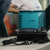 Victrola Revolution Go Turntable - Blue + Entertainment Stand Bundle - Black - Introducing the award-winning Victrola Revolution GO, the world's pioneering portable, rechargeable Bluetooth record player. With its battery-powered design, the Revolution GO lets you enjoy your vinyl collection wherever you go.