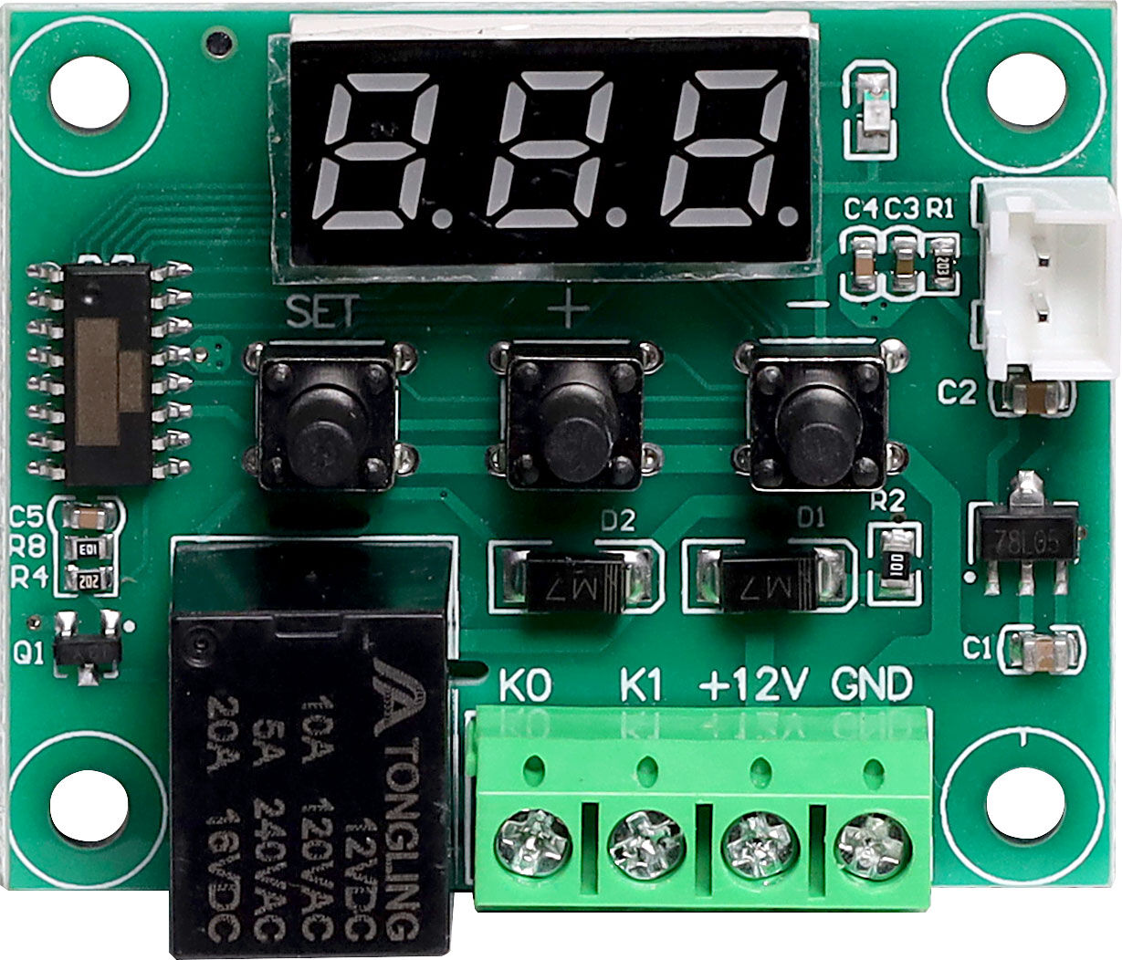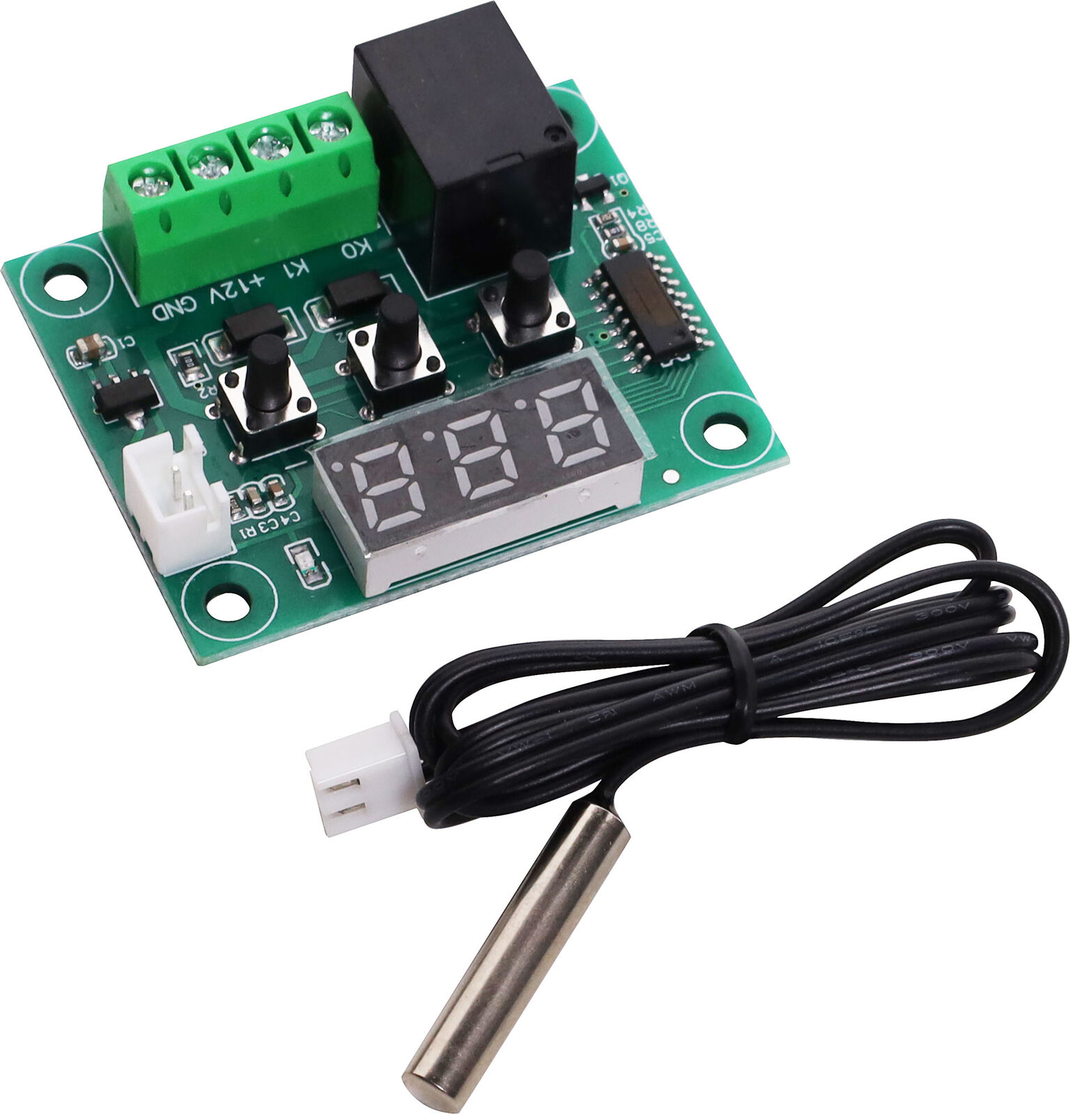 This high precision temperature control module is a highly functional self-contained temperature controller module for both heating and cooling applications. The module measures and displays the temperature and allows you to control power to most types of electrical equipment based on that temperature. A single output relay can be turned ON or turned OFF as temperature rises or lowers past a thermal threshold that you set. You can also set a temperature hysteresis, relay activation delay and thermal limits for the modules operation.